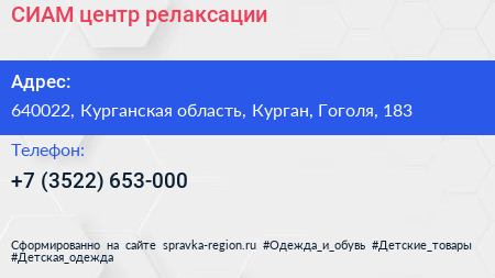 СИАМ, центр релаксации по адресу 640022, Курганская область, Курган, Гоголя, 183 в дальнейшем Организация, размещена в следующих категориях:
