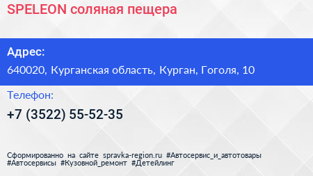 SPELEON, соляная пещера по адресу 640020, Курганская область, Курган, Гоголя, 10 в дальнейшем Организация, размещена в следующих категориях: