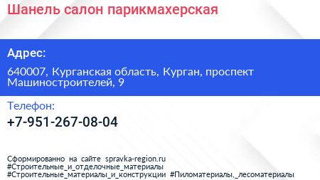 Шанель, салон-парикмахерская по адресу 640007, Курганская область, Курган, проспект Машиностроителей, 9 в дальнейшем Организация, размещена в следующих категориях: