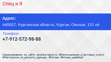 Спец и Я по адресу 640027, Курганская область, Курган, Омская, 151 к6 в дальнейшем Организация, размещена в следующих категориях:
