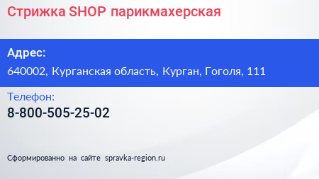 Стрижка-SHOP, парикмахерская по адресу 640002, Курганская область, Курган, Гоголя, 111 в дальнейшем Организация, размещена в следующих категориях: