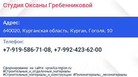 Студия Оксаны Гребенниковой по адресу 640020, Курганская область, Курган, Гоголя, 10 в дальнейшем Организация, размещена в следующих категориях: