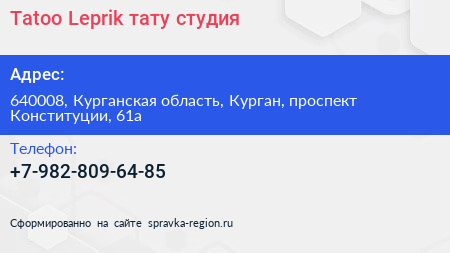 Tatoo Leprik, тату студия по адресу 640008, Курганская область, Курган, проспект Конституции, 61а в дальнейшем Организация, размещена в следующих категориях: