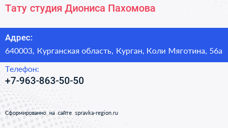 Тату-студия Диониса Пахомова по адресу 640003, Курганская область, Курган, Коли Мяготина, 56а в дальнейшем Организация, размещена в следующих категориях: