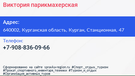 Виктория, парикмахерская по адресу 640002, Курганская область, Курган, Станционная, 47 в дальнейшем Организация, размещена в следующих категориях: