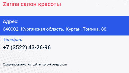 Zarina, салон красоты по адресу 640002, Курганская область, Курган, Томина, 88 в дальнейшем Организация, размещена в следующих категориях: