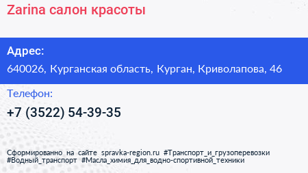 Zarina, салон красоты по адресу 640026, Курганская область, Курган, Криволапова, 46 в дальнейшем Организация, размещена в следующих категориях:
