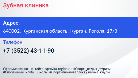 Зубная клиника по адресу 640002, Курганская область, Курган, Гоголя, 17/3 в дальнейшем Организация, размещена в следующих категориях: