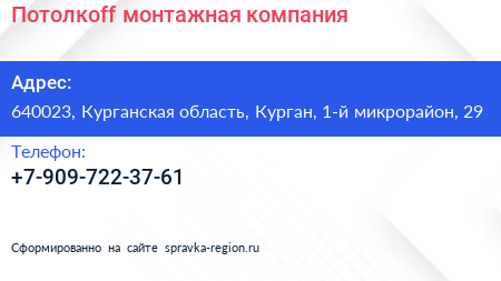 Потолкоff, монтажная компания по адресу 640023, Курганская область, Курган, 1-й микрорайон, 29 в дальнейшем Организация, размещена в следующих категориях: