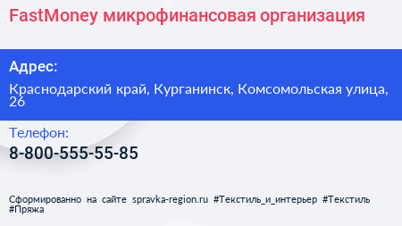 FastMoney, микрофинансовая организация по адресу Краснодарский край, Курганинск, Комсомольская улица, 26 в дальнейшем Организация, размещена в следующих категориях: