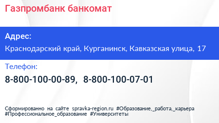 Газпромбанк, банкомат по адресу Краснодарский край, Курганинск, Кавказская улица, 17 в дальнейшем Организация, размещена в следующих категориях: