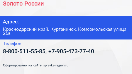 Золото России по адресу Краснодарский край, Курганинск, Комсомольская улица, 26в в дальнейшем Организация, размещена в следующих категориях: