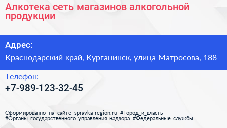 Алкотека, сеть магазинов алкогольной продукции по адресу Краснодарский край, Курганинск, улица Матросова, 188 в дальнейшем Организация, размещена в следующих категориях: