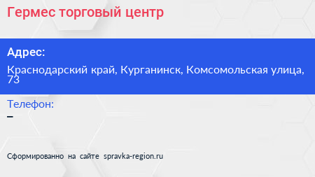 Гермес, торговый центр по адресу Краснодарский край, Курганинск, Комсомольская улица, 73 в дальнейшем Организация, размещена в следующих категориях: