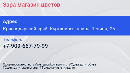 Зара, магазин цветов по адресу Краснодарский край, Курганинск, улица Ленина, 26 в дальнейшем Организация, размещена в следующих категориях:
