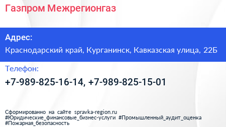 Газпром Межрегионгаз по адресу Краснодарский край, Курганинск, Кавказская улица, 22Б в дальнейшем Организация, размещена в следующих категориях: