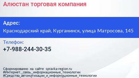 Алюстан, торговая компания по адресу Краснодарский край, Курганинск, улица Матросова, 145 в дальнейшем Организация, размещена в следующих категориях: