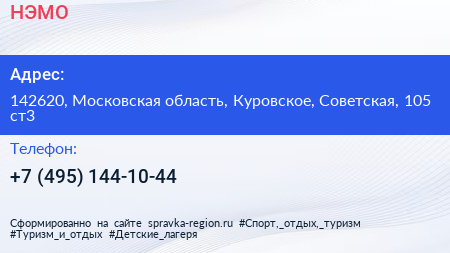 НЭМО по адресу 142620, Московская область, Куровское, Советская, 105 ст3 в дальнейшем Организация, размещена в следующих категориях: