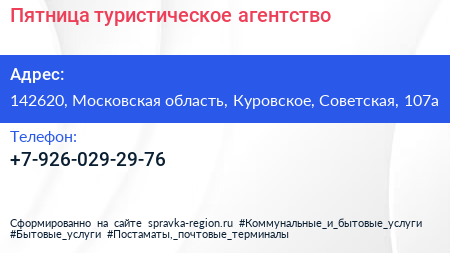 Пятница, туристическое агентство по адресу 142620, Московская область, Куровское, Советская, 107а в дальнейшем Организация, размещена в следующих категориях: