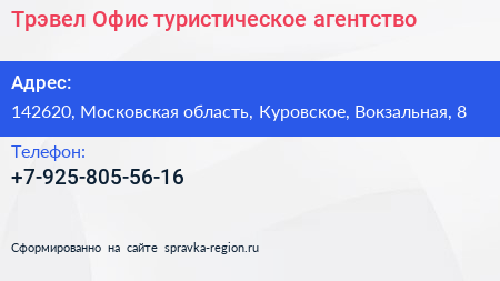 Трэвел Офис, туристическое агентство по адресу 142620, Московская область, Куровское, Вокзальная, 8 в дальнейшем Организация, размещена в следующих категориях: