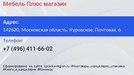 Мебель Плюс, магазин по адресу 142620, Московская область, Куровское, Почтовая, 6 в дальнейшем Организация, размещена в следующих категориях: