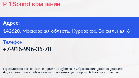 R-1 Sound, компания по адресу 142620, Московская область, Куровское, Вокзальная, 6 в дальнейшем Организация, размещена в следующих категориях: