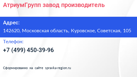 АтриумГрупп, завод-производитель по адресу 142620, Московская область, Куровское, Советская, 105 в дальнейшем Организация, размещена в следующих категориях:
