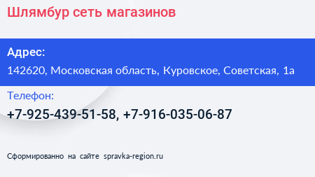 Шлямбур, сеть магазинов по адресу 142620, Московская область, Куровское, Советская, 1а в дальнейшем Организация, размещена в следующих категориях: