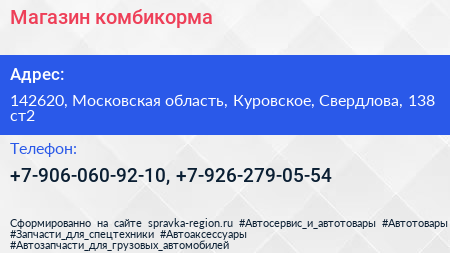 Магазин комбикорма по адресу 142620, Московская область, Куровское, Свердлова, 138 ст2 в дальнейшем Организация, размещена в следующих категориях: