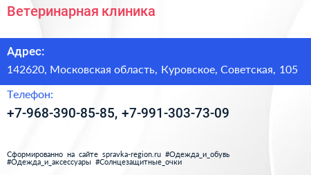 Ветеринарная клиника по адресу 142620, Московская область, Куровское, Советская, 105 в дальнейшем Организация, размещена в следующих категориях:
