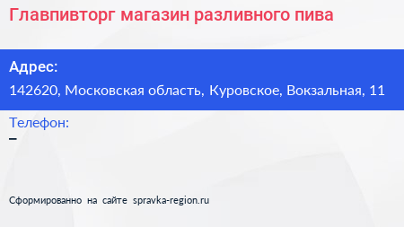 Главпивторг, магазин разливного пива по адресу 142620, Московская область, Куровское, Вокзальная, 11 в дальнейшем Организация, размещена в следующих категориях: