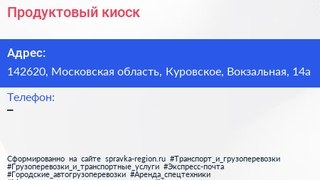 Продуктовый киоск по адресу 142620, Московская область, Куровское, Вокзальная, 14а в дальнейшем Организация, размещена в следующих категориях: