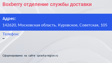 Boxberry, отделение службы доставки по адресу 142620, Московская область, Куровское, Советская, 105 в дальнейшем Организация, размещена в следующих категориях: