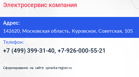 Электросервис, компания по адресу 142620, Московская область, Куровское, Советская, 105 в дальнейшем Организация, размещена в следующих категориях: