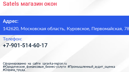 Satels, магазин окон по адресу 142620, Московская область, Куровское, Первомайская, 78 в дальнейшем Организация, размещена в следующих категориях: