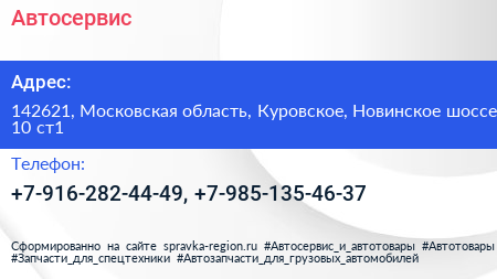 Автосервис по адресу 142621, Московская область, Куровское, Новинское шоссе, 10 ст1 в дальнейшем Организация, размещена в следующих категориях: