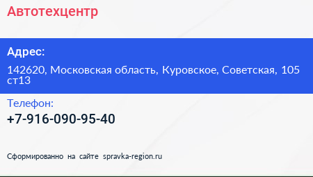 Автотехцентр по адресу 142620, Московская область, Куровское, Советская, 105 ст13 в дальнейшем Организация, размещена в следующих категориях: