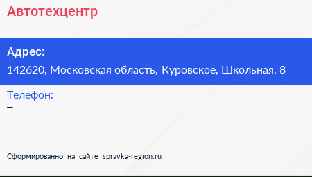 Автотехцентр по адресу 142620, Московская область, Куровское, Школьная, 8 в дальнейшем Организация, размещена в следующих категориях: