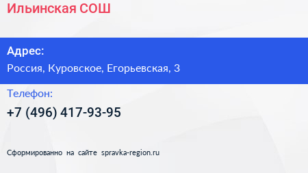 Ильинская СОШ по адресу Ильинская школа, 3, Егорьевская улица, Ильинский Погост, Орехово-Зуевский городской округ, Московская область, Центральный федеральный округ, 142651, Россия в дальнейшем Организация, размещена в следующих категориях: