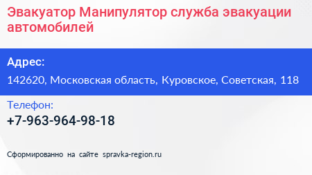 Эвакуатор-Манипулятор, служба эвакуации автомобилей по адресу 142620, Московская область, Куровское, Советская, 118 в дальнейшем Организация, размещена в следующих категориях: