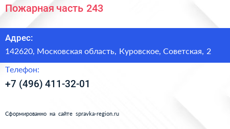 Пожарная часть №243 по адресу 142620, Московская область, Куровское, Советская, 2 в дальнейшем Организация, размещена в следующих категориях: