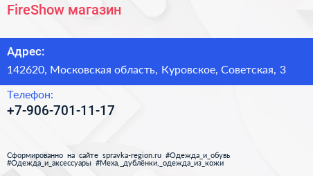 FireShow, магазин по адресу 142620, Московская область, Куровское, Советская, 3 в дальнейшем Организация, размещена в следующих категориях: