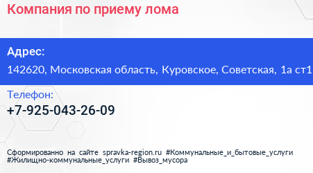 Компания по приему лома по адресу 142620, Московская область, Куровское, Советская, 1а ст1 в дальнейшем Организация, размещена в следующих категориях:
