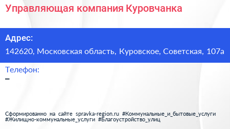Управляющая компания Куровчанка по адресу 142620, Московская область, Куровское, Советская, 107а в дальнейшем Организация, размещена в следующих категориях: