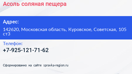 Асоль, соляная пещера по адресу 142620, Московская область, Куровское, Советская, 105 ст3 в дальнейшем Организация, размещена в следующих категориях: