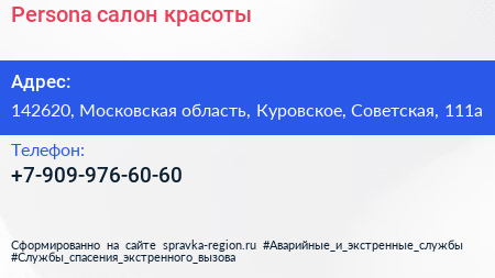 Persona, салон красоты по адресу 142620, Московская область, Куровское, Советская, 111а в дальнейшем Организация, размещена в следующих категориях: