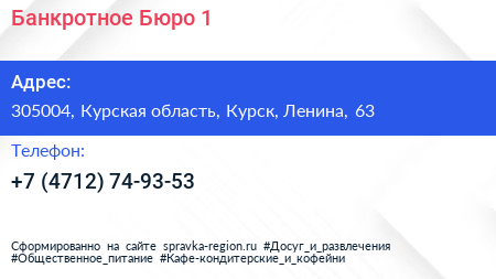 Банкротное Бюро №1 по адресу 305004, Курская область, Курск, Ленина, 63 в дальнейшем Организация, размещена в следующих категориях: