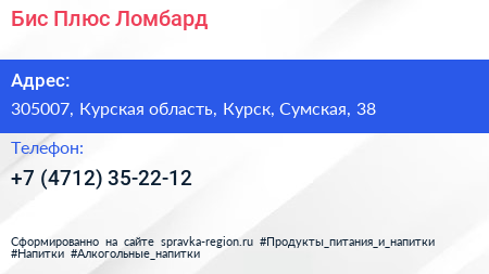 Бис Плюс-Ломбард по адресу 305007, Курская область, Курск, Сумская, 38 в дальнейшем Организация, размещена в следующих категориях: