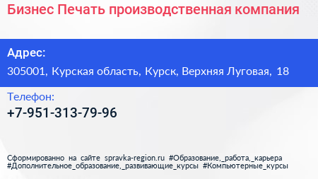Бизнес Печать, производственная компания по адресу 305001, Курская область, Курск, Верхняя Луговая, 18 в дальнейшем Организация, размещена в следующих категориях: