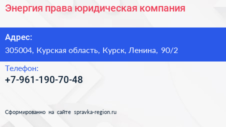 Энергия права, юридическая компания по адресу 305004, Курская область, Курск, Ленина, 90/2 в дальнейшем Организация, размещена в следующих категориях: